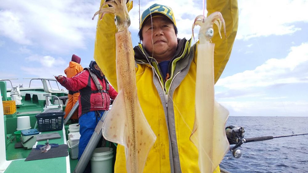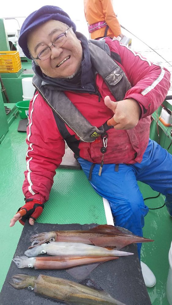 港に戻ってきた船には釣りたてのヤリイカが干されていました。